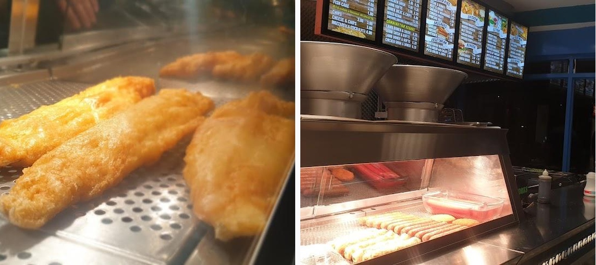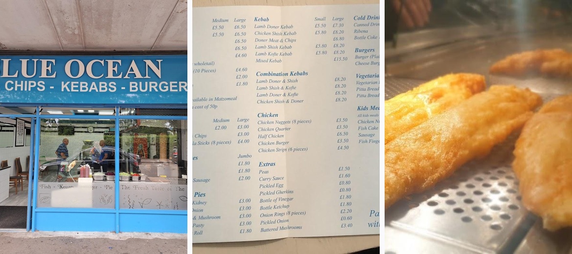 Blue Ocean Fish And Chips specializes in classic fish and chips, kebabs, and a variety of other takeaway options like burgers and sausages. You can find dishes like cod, haddock, and lamb shish.